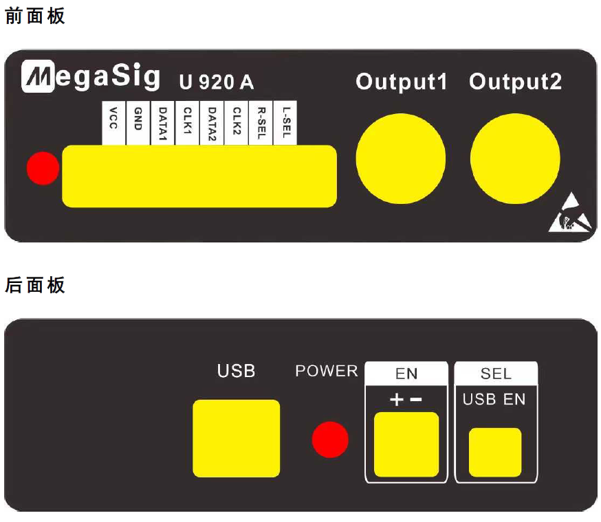 U920A為雙通道輸出,並採用獨立的解調晶片,底噪更低以及硬體響應更快;支援電壓調節與時脈調節(串口程控);輸出採用BNC接口,訊號為類比訊號,方便搭配各式分析儀與聲卡使用。
